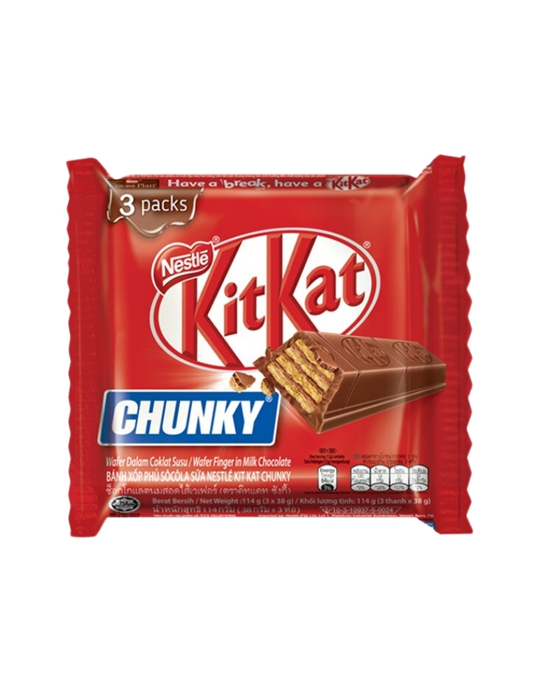 KitKat Chunky Pack of 3 contains three individually wrapped thick chocolate bars with a crispy wafer interior. Ideal for retail shelves, corporate gifts, and export, each bar delivers the rich flavor and satisfying crunch that KitKat Chunky is known for.