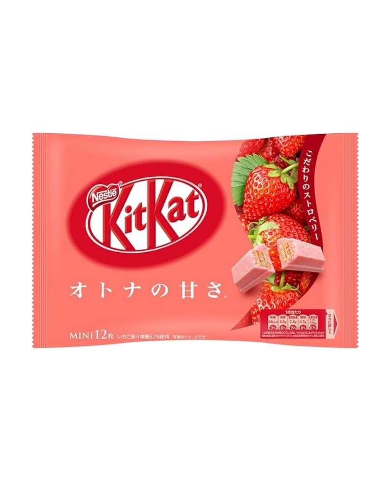 KitKat Japan Pack of 12 Strawberries features twelve individually wrapped bars infused with authentic strawberry flavor. Each bar combines the classic crisp wafer with strawberry chocolate coating, suitable for gifting, retail, or international distribution for customers seeking unique Japanese treats.